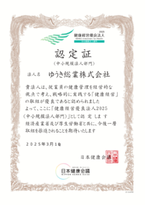 この認定は従業員の健康を大切にし、働きやすい環境づくりに積極的に取り組んでいる企業に与えられるものです。